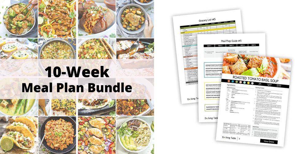 Save time, money, and hassle with this 10-Week Meal Plan Bundle that is completely customizable! 10 printable PDFs that each come with 6 healthy, family-friendly dinner recipes from EvolvingTable.com (all can be made GF + DF), nutritional information, an organized grocery list, and a meal-prep guide. The recipes are from Meal Plans #1-10 and include: