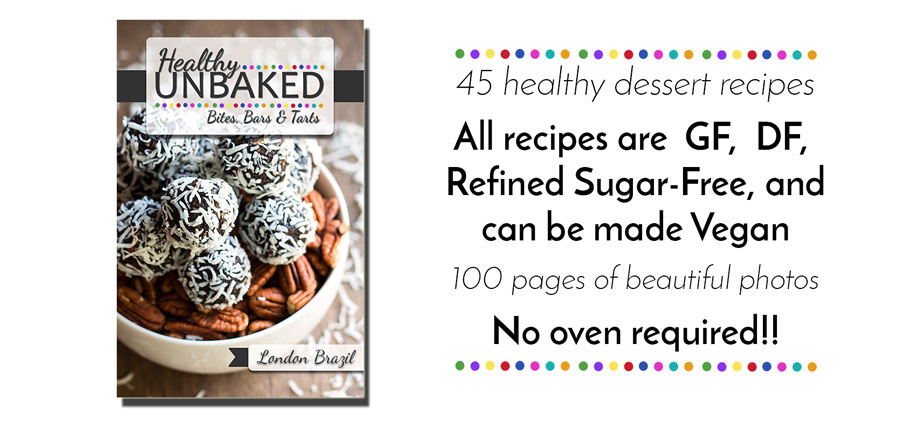Healthy Unbaked Bites, Bars, and Tarts is an e-cookbook full of 45 healthy dessert recipes that do not require any baking and are gluten-free, refined sugar-free, dairy-free, and vegan!